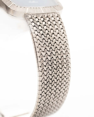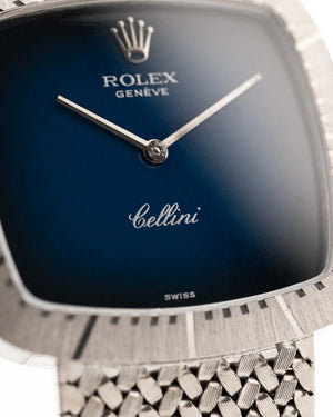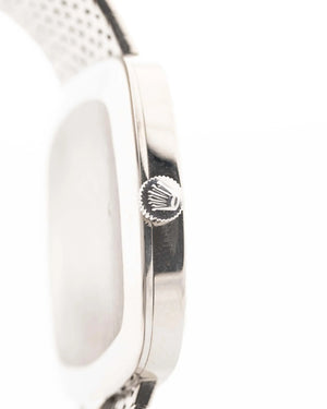 The Rolex Cellini line showcases the dressier side of Rolex compared to its more well-known sport models. This version is fitted in a 18k-yellow-gold square-shaped case, which is an unusual case shape for Rolex.