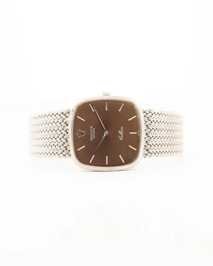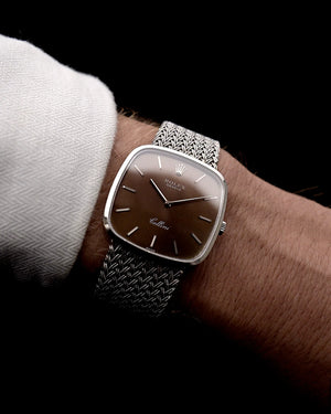 The Rolex Cellini line showcases the dressier side of Rolex compared to its more well-known sport models. This version is fitted in a 18k white gold square-shaped case with a beautiful aged brown dial.
