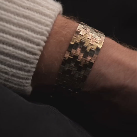 This particular model is distinguished by its rare Trinity 9 carat gold bracelet, an exquisite blend of yellow, white, and rose gold links that create a harmonious tri-tone aesthetic—both sophisticated and versatile.